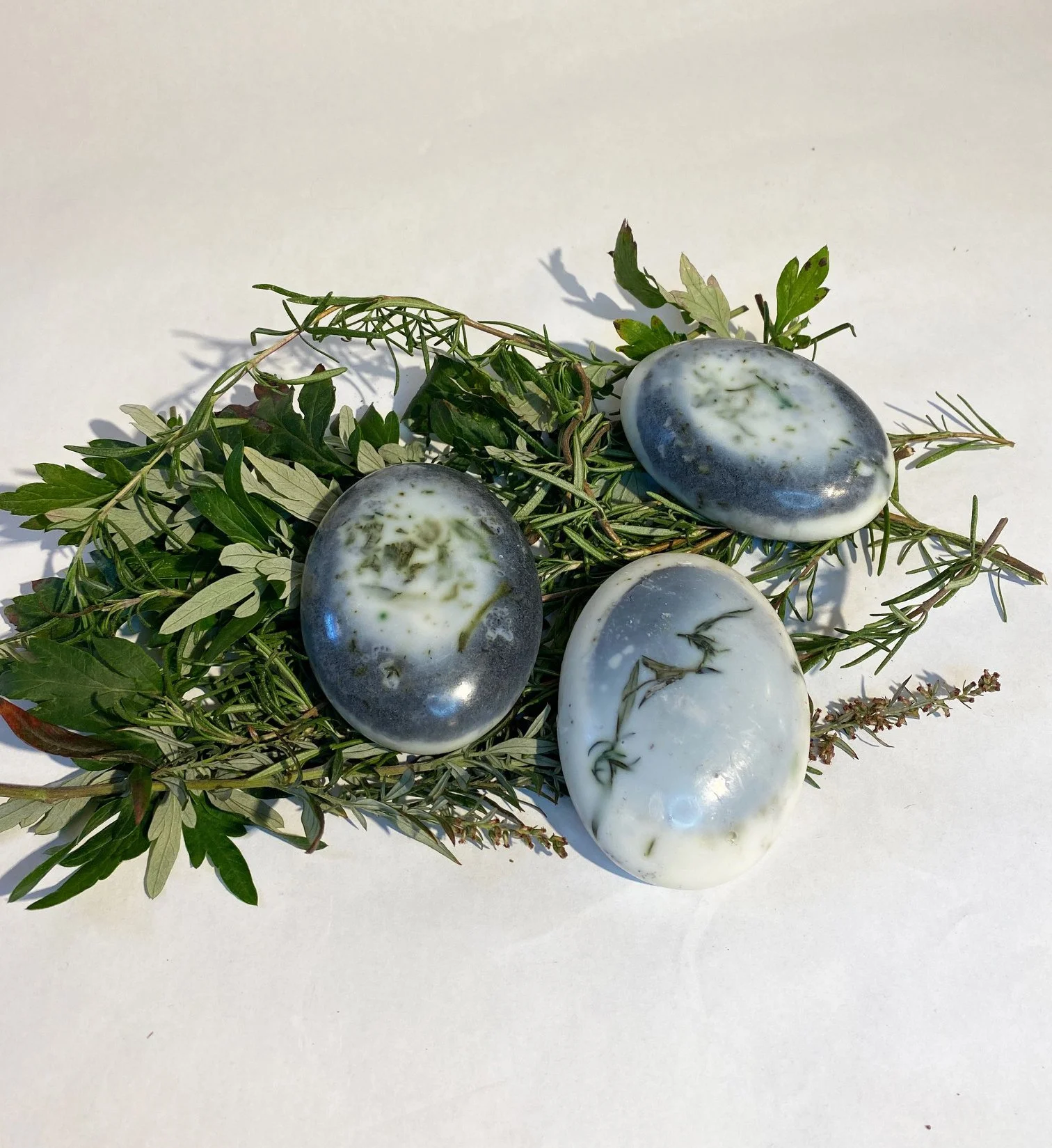 Formulated with henbane flower essence, black salt, charcoal, rosemary, mugwort, and basil, this deep-cleansing bar helps sweep away psychic interference.
